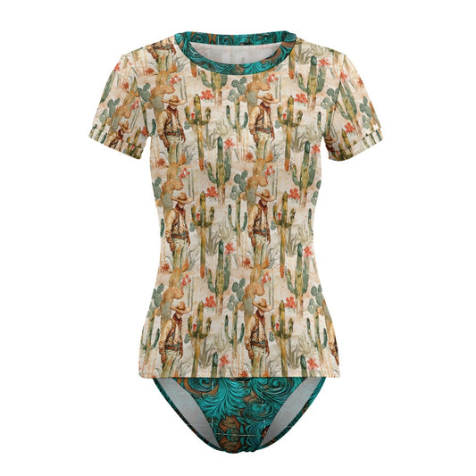 Brewster County Cowboy Turquoise Leather Print Short Sleeve Two Piece Bikini Swimsuit